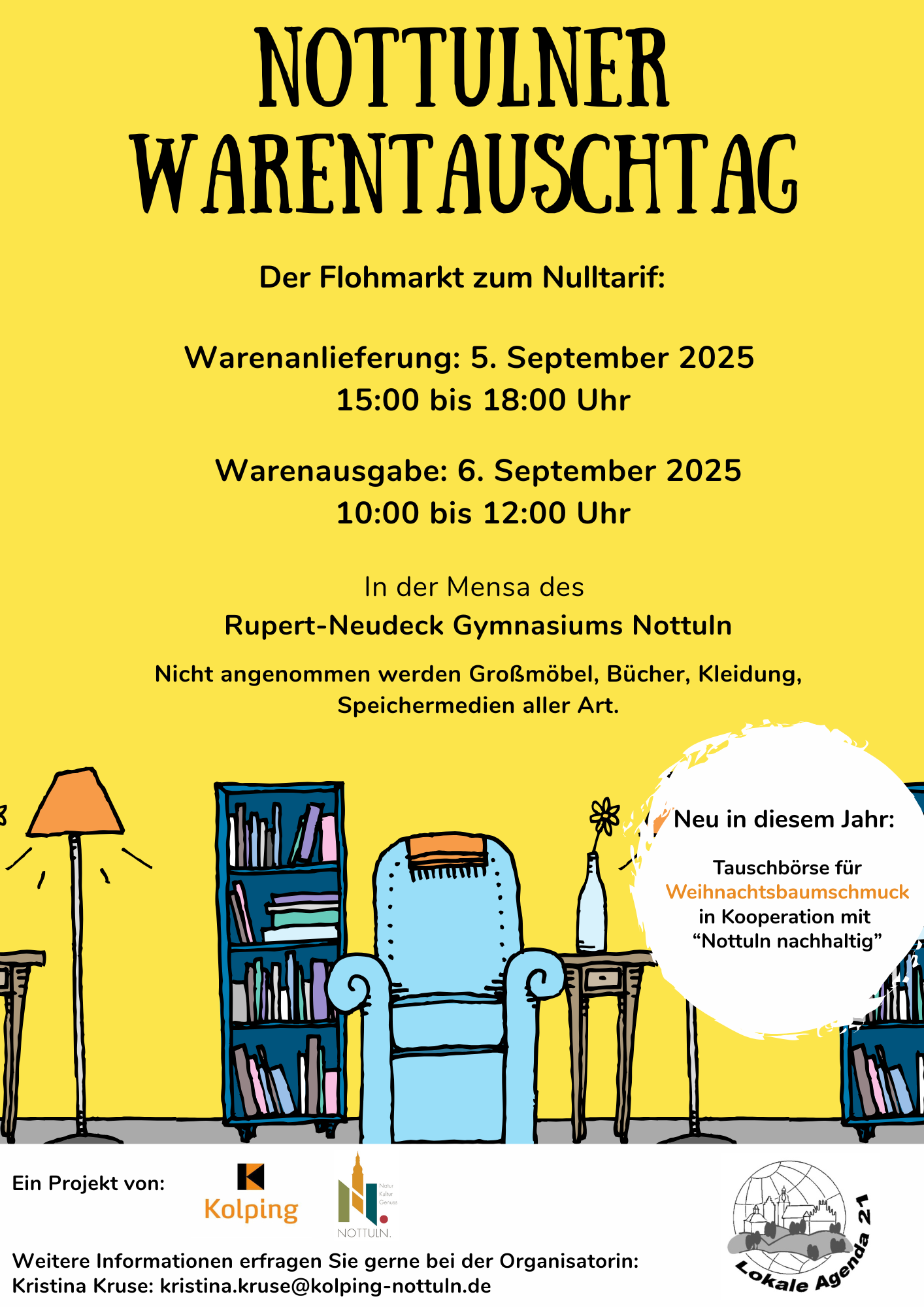 Unter dem Motto „Verschenken statt wegwerfen“ veranstaltete die Kolpingsfamilie Nottuln gemeinsam mit Nottuln nachhaltig am 6. September 2025 erneut ihre beliebte Warentauschbörse. Bürgerinnen und Bürger hatten am Freitag bereits gut erhaltene Gegenstände abgegeben – von Haushaltswaren über Weihnachtsdeko bis hin zu Spielzeug. Wer am Samstag dann etwas Nützliches entdeckte, durfte es kostenlos mitnehmen.